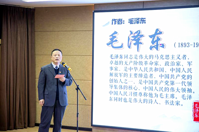 华中师范大学政国院党委书记、湖北省中华诗词学会会长段维解读《沁园春·雪》。深刻表达了对中国共产党领导中国人民进行革命、建设和改革伟大功绩的赞颂,激励社区工作者将伟大建党精神融入到社区基层工作中,为提高社区居民的幸福感和获得感不懈努力。