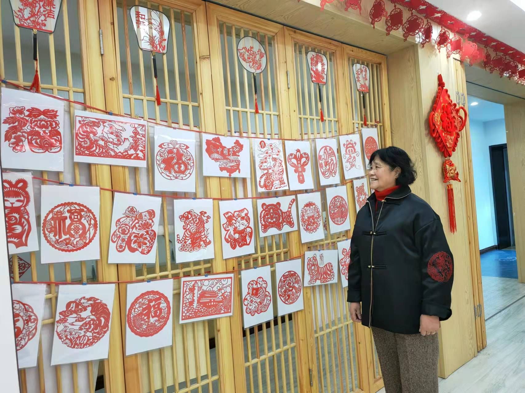 活动现场不仅对2021年汉绣、工笔画、剪纸、书法培训成果进行了汇报、展示,还充分展现了中国传统文化非遗艺术之美。喜庆祥和的剪纸墙、温馨舒适的回忆小景、精彩纷呈的走廊,都成为了居民拍照留念的最佳点位。