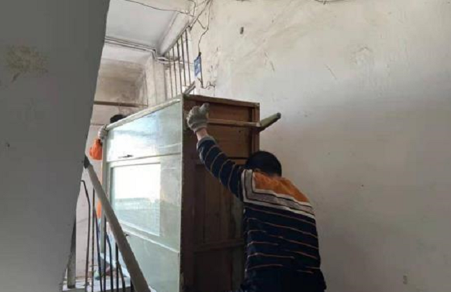 德望社区充分发挥不怕苦、不怕累的精神,对辖区无物业老旧小区楼道乱堆放的无主旧家具及废弃物进行清理,大家齐心协力,楼道很快就焕然一新。