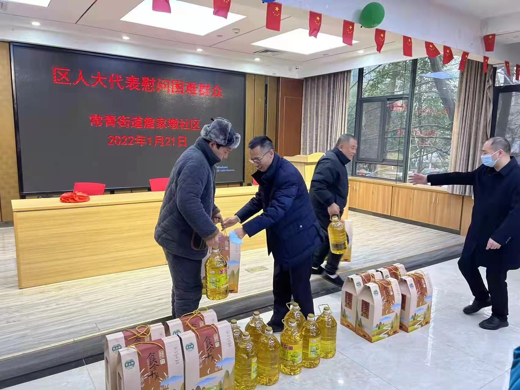 春节将至,喜意浓浓!为了让武汉市江汉区常青街道詹家墩社区困难群众过上温馨、幸福、祥和的春节,2022年1月21日上午,江汉区人大代表、武汉云计算机有限公司董事长钟收成带领工作人员来到常青街道詹家墩社区,慰问了詹家墩社区的困难群众,为他们送去了米、油等慰问品,让他们在寒冬中感受到社会大家庭的温暖。