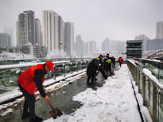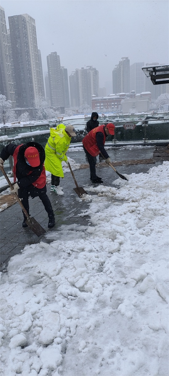 大年初七,一场降雪不期而遇,唐家辖区被包裹成一片白色盛景,美不胜收。降雪过后,道路积雪严重,给群众出行和道路交通带来了诸多不便。为维护道路交通安全,方便群众出行,唐家墩街道提前部署,街领导、各社区工作人员、党员志愿者、辖区共建单位等迅速行动起来,集中开展扫雪除冰活动,及时清扫道路积雪,预防结冰。