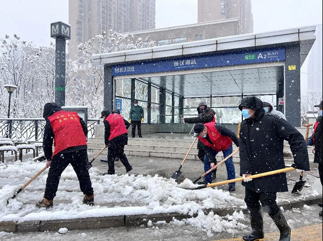 姑嫂树社区组织党员和志愿者对辖区地铁6号线杨汊湖出入口周边积雪进行了清理,并做撒盐处理,防止路面结冰,为居民出行提供了便利。