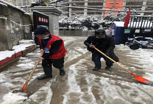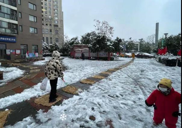 针对突降的大雪和可能发生的冰冻,常远里社区积极应对,迅速组织全体工作人员、志愿者开展积雪清扫和融雪防滑工作。大家不畏严寒、团结协作,一边清理道路积雪,一边给斜坡路铺上麻袋,防止清理过的路面结冰,彻底消除安全隐患。