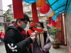 悬挂着谜语的红色纸条随风飘荡、喜气洋洋。当主持人宣布猜灯谜活动开始时,居民们争先恐后地看谜面、猜谜语,有的默默沉思,有的互相探讨,共同体验灯谜带来的乐趣,不时传出阵阵开心的笑声。谜面有大家喜闻乐见的字谜,还有猜成语、猜人名等,大家乐中有学,共同领略汉语语言的无穷奥妙。“平时要照顾生意没时间在家里做元宵,今天社区这边有活动,刚好过来学一学,跟大家在一起十分热闹。”居民徐女士说。