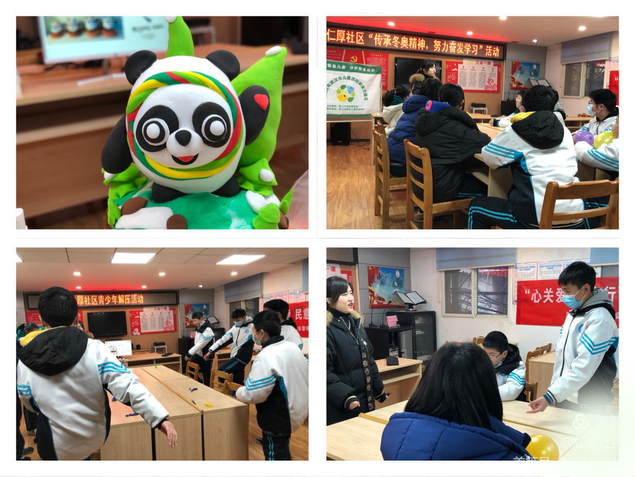 2022年2月17日,民意街道仁厚社区联合辖区七十五中学在社区青少年服务站共同开展了“传承冬奥精神,燃起梦想”讲座活动。邀请专业心理解压老师为孩子们讲课,以“压力我不怕,解压有办法”为主题,传授各种“解压方法”,引导孩子们练习减压运动,从压力测试了解自身压力情况,认知到压力也是动力,压力大小可以自我调节,可以自己做主。同学们共同讨论分析压力来源与压力对学习、生活、身心健康的影响,共同实践做手工解压,一起用超轻黏土完成了代表北京冬奥会的吉祥物“冰墩墩”,解读奥运精神,孩子们表示之后要将这种精神运用到学习中,像冬奥会运动员们在激烈的赛场中那样面对压力,学会释放压力,变压力为动力,发奋学习。30余名七十五中学学生参加本次活动。