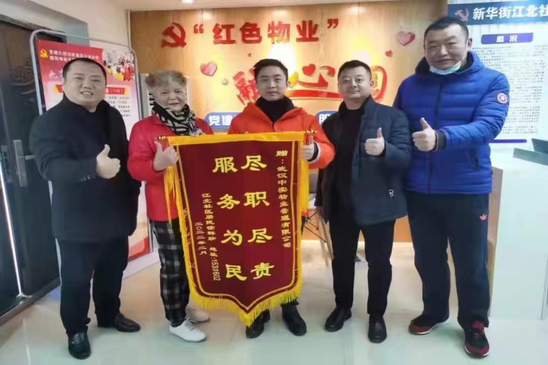 今年除夕深夜,江北社区居民徐阿姨焦急的向社区求助,自家厕所的下水管道堵塞了,家里全是水,又脏又臭。社区网格员立即把徐阿姨家的情况告知了“红色管家”陈晗。陈晗立即联系维修人员和保洁人员第一时间赶到徐阿姨家,他和维修师傅迅速查明情况,做好紧急疏通和后续清扫工作,让徐阿姨一家过了一个祥和的新年。新年一到,徐阿姨来到社区,送来一面写着“尽职尽责,服务为民”的锦旗,夸他解了自己的燃眉之急——“物业管家真的把我们当作一家人,小区有了他们,我一个人住都放心多了。谢谢管家,谢谢社区。”