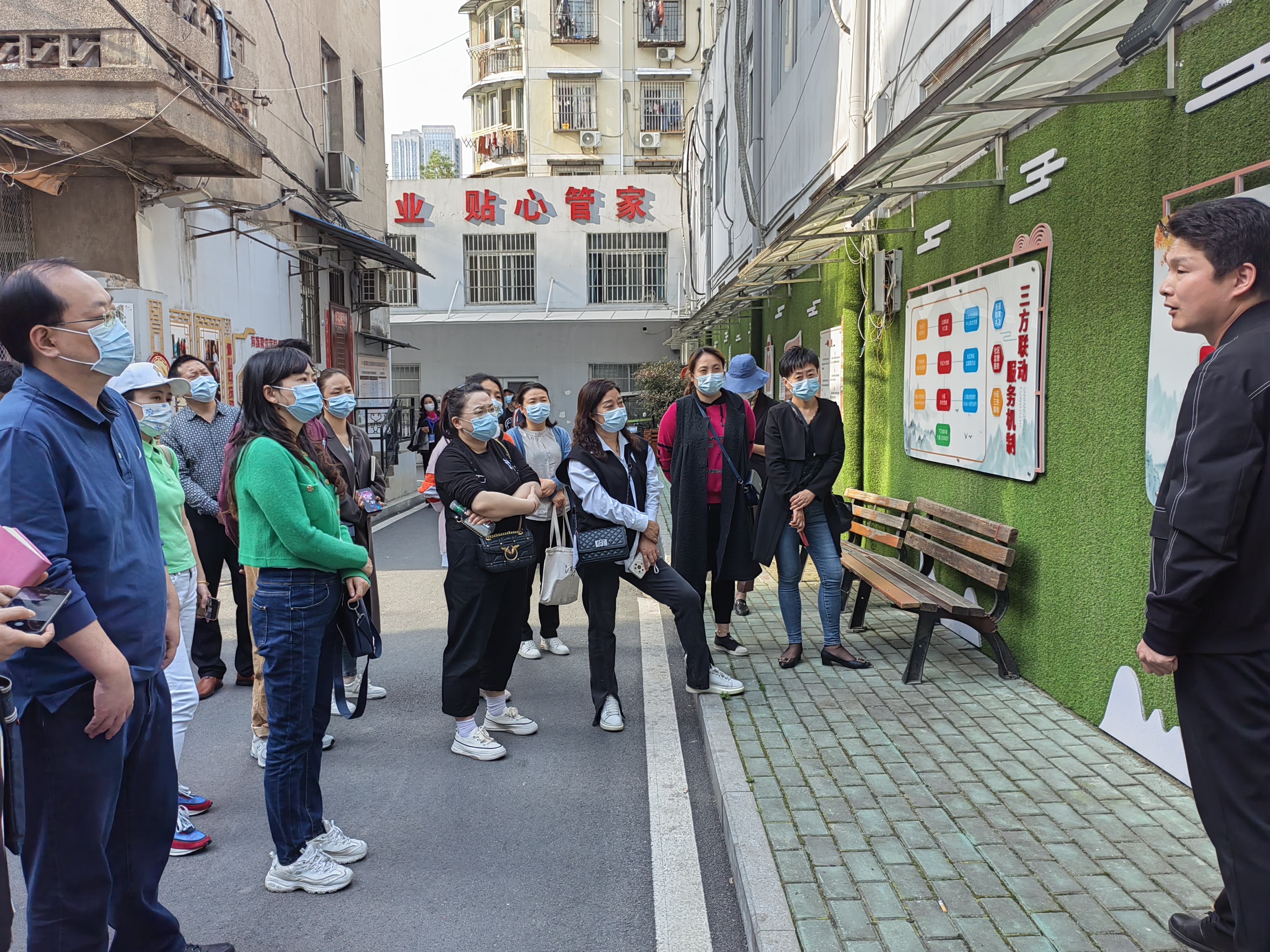 紧接着郑敏书记带领队伍到北湖街道和风里社区物业服务中心学习三方联动机制和红色物业联合会建设及运行情况,针对红色物业联合会组织架构、理事情况、人员配备、资金运行等问题进行了详细了解,了解了社区“5+7+10”工作法,参观了老旧小区改造的活动阵地,并认真听取了社区基层治理形成的经验做法。