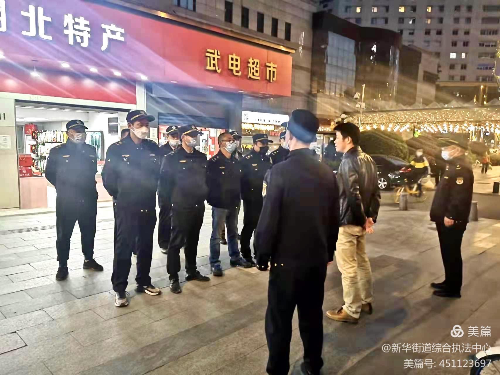 为积极响应市城管委关于在全市范围内开展违法占道经营集中整治工作的安排,进一步优化街辖市容秩序,新华街道全面部署动员,4月14日晚19时许,由街人武部部长熊恒带队,街执法中心刘汉桥、杨世成参与,共10余名综合巡查队员对天安夜市进行夜间市容环境专项整治。