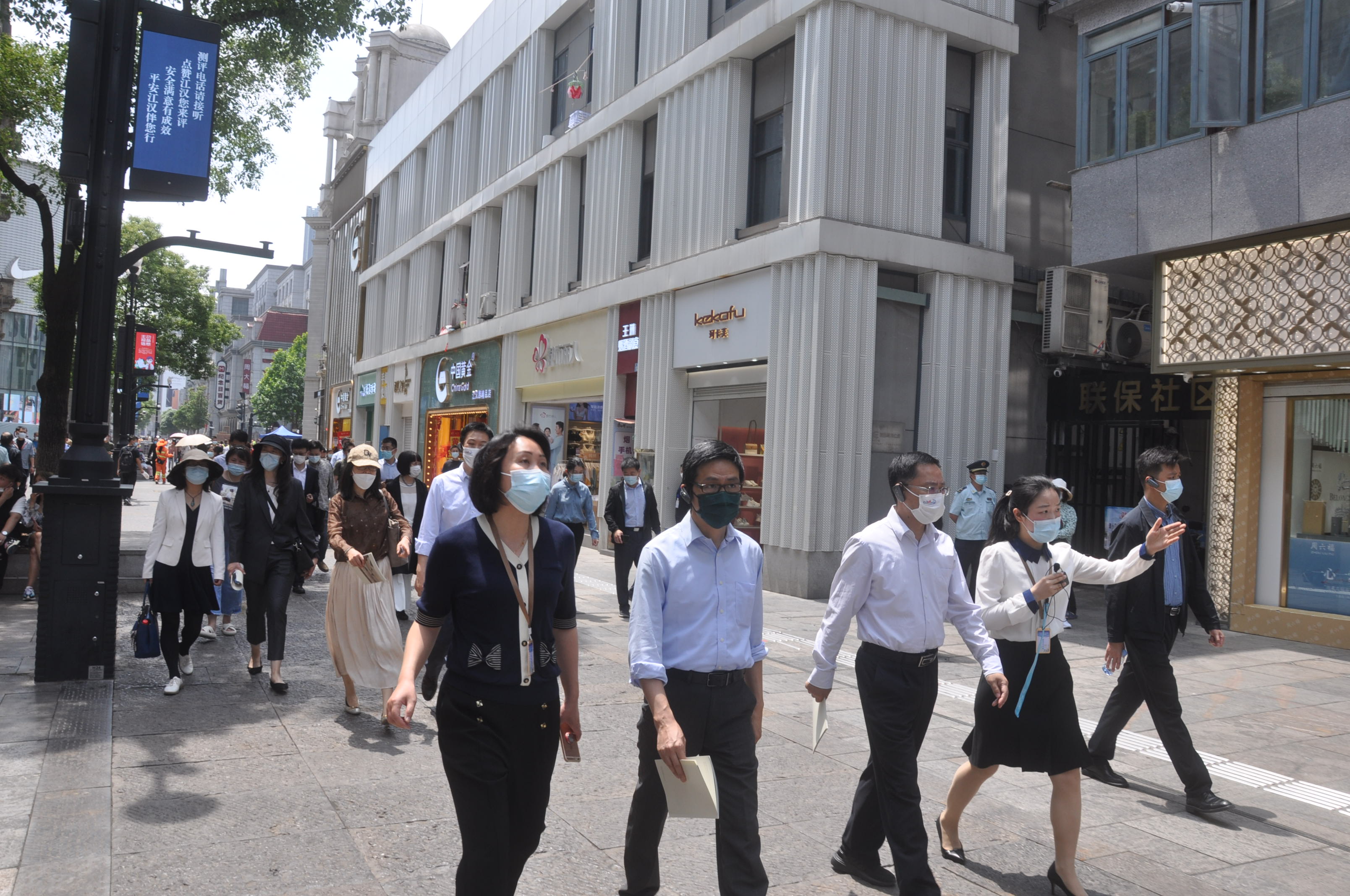 2022年5月17日,澳门特别行政区旅游局、贸易投资促进局代表团一行在省市港澳办和市区各部门的陪同下来到江汉路步行街,全方位考察和体验江汉路步行街整体风貌,江汉区委办、区委外办全程参与了考察工作。