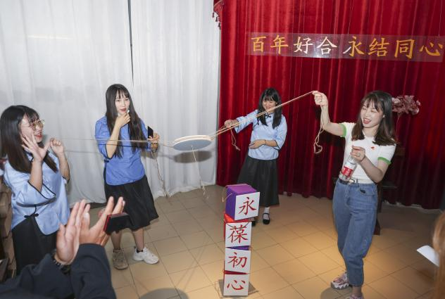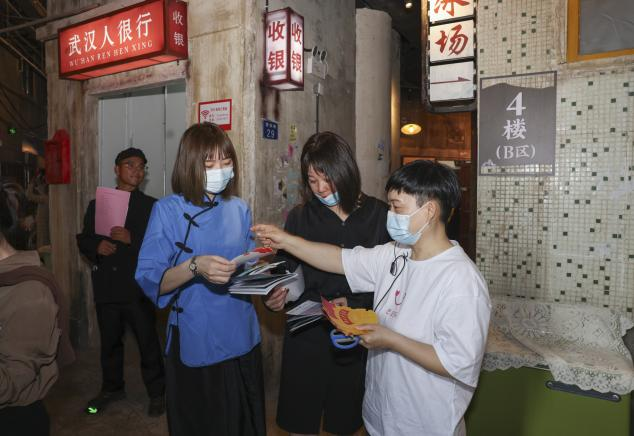 沉浸体验环节是本次活动的最大亮点。在会场楼下的老武汉特色民俗街区,选取江汉关、黄鹤楼、阅马场等不同地点,设置了8项任务,每完成一项任务就可收集一个印章,成功收集到8个印章后,就可以兑换到一个团徽标牌贴。大家兴致勃勃、不畏失败、相互配合,在8个打卡点先后完成了“你做我猜”“平衡托盘”等小游戏,在一次次的实践中追忆党史、洗涤心灵。在得到团徽标牌贴后,大家返回会场,将团徽标牌贴在党旗展板四周,象征着青年团员们紧紧围绕在党的周围、紧跟党的步伐。