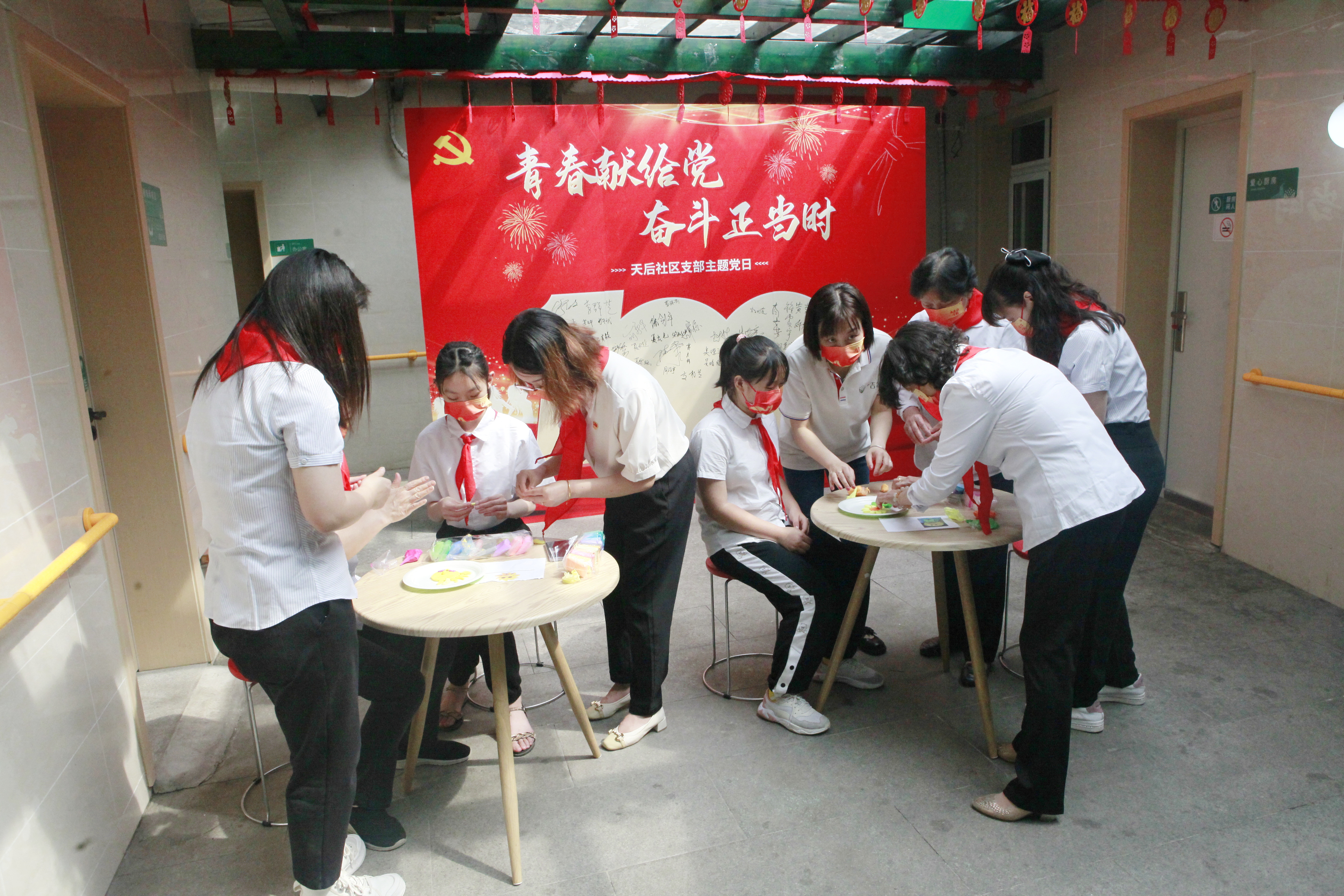 18日,民意街道天后社区“青春献给党,奋斗正当时”支部主题党日活动在社区居家养老服务中心开展,邀请到共建单位天一街小学少先队员代表们参与,一同为5月“政治生日”的老党员们庆生。两位5月过政治生日的党员在“赠良言送诤语”环节中分享自己的入党初心和青春奋斗故事,天一街小学少先队员代表和社区年轻党员为老党员们送上诗歌朗诵《青春》及手工泥塑作品《向日葵》,学生们依次为老党员佩戴上鲜艳的红领巾,并两两结对盖上彩色手印,以表对老党员的敬佩和爱戴之情。一场庄严宣誓、一回暖心分享、一份“生日”礼物、一条红领巾、一对大小手掌......天后社区通过五个“一”活动,为老党员们送上了特别的“政治生日”礼物,也让爱国红心从书本上走到青少年的现实生活中,将红心这颗种子,种在每一个中国娃的心中。