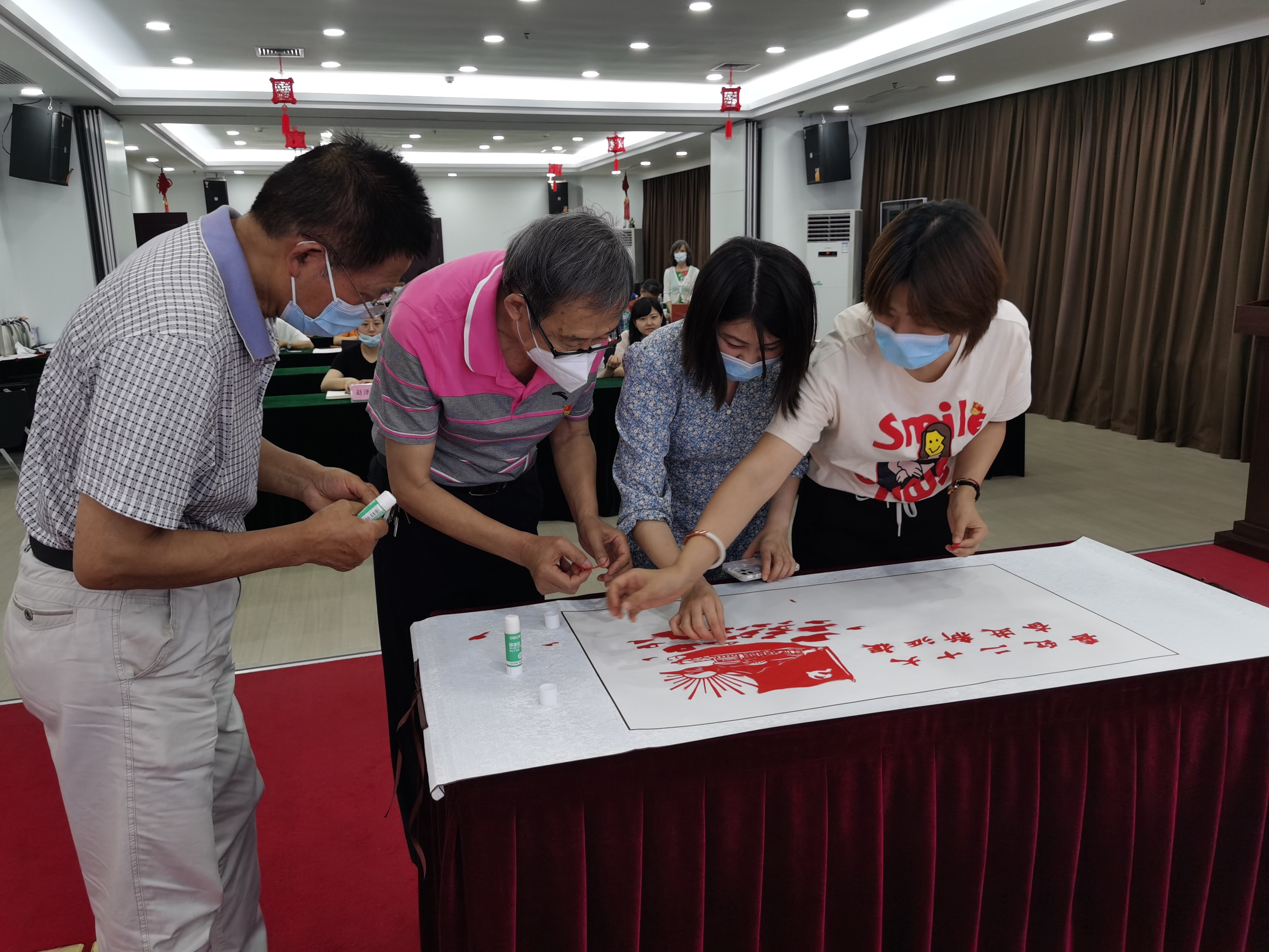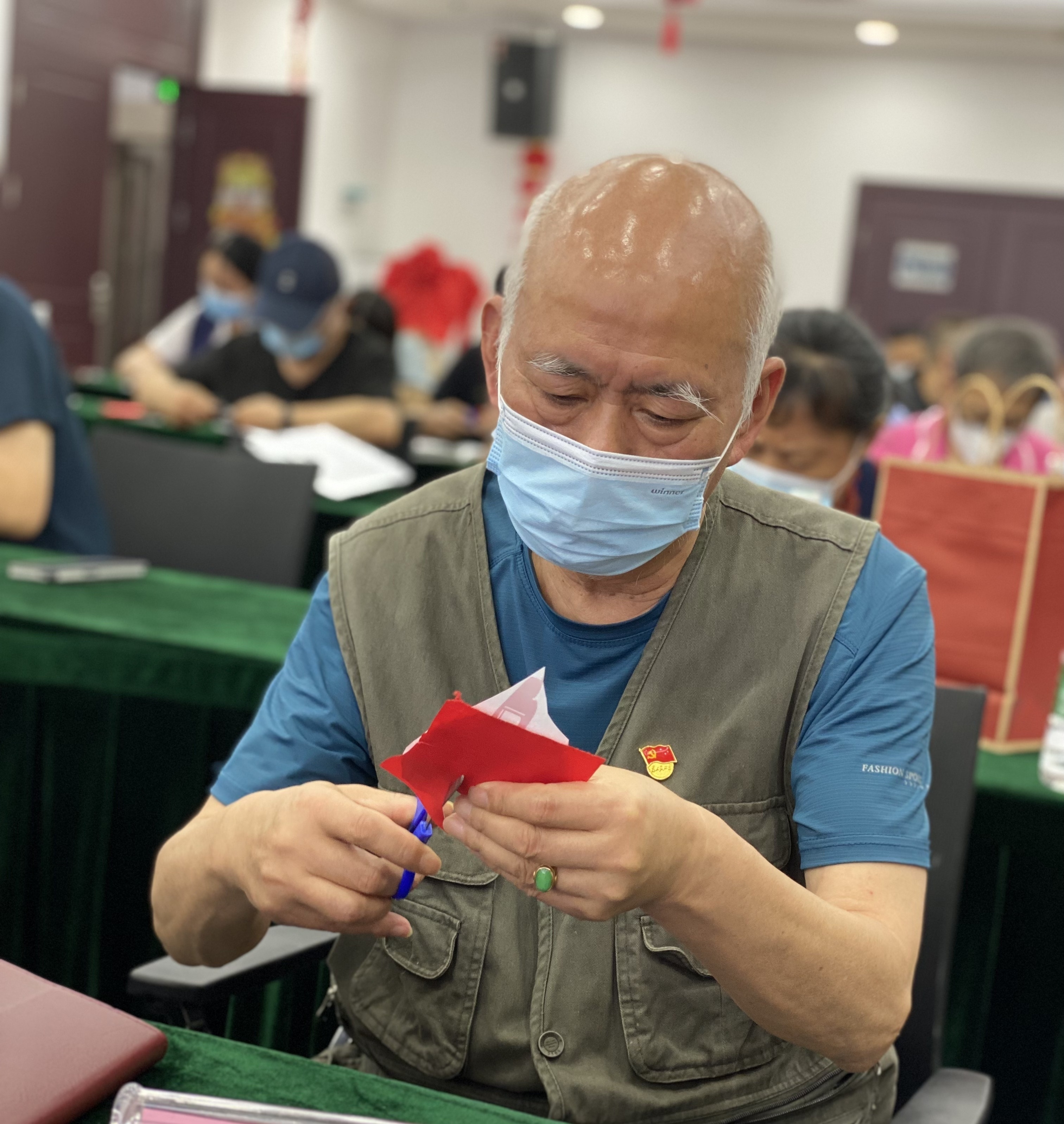 在最后的“剪纸共创红船”环节,听完“红船精神”的概叙后,在社工们的指导下,一只只小红船,通过老青党员代表们灵巧的手,陆续剪出来,大家纷纷走上讲台,将自己精心剪出的红船张贴在旭日当红的主船周围。