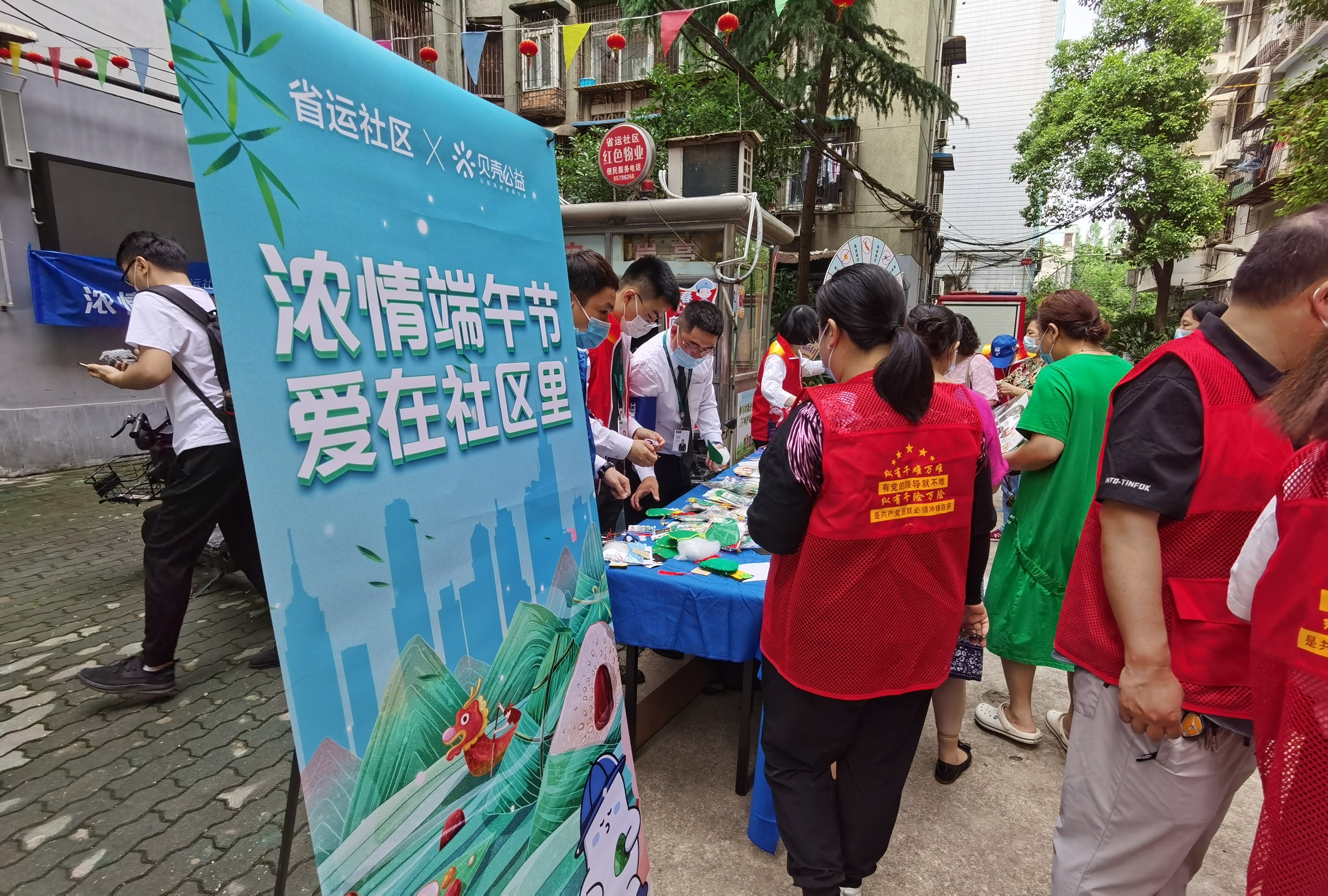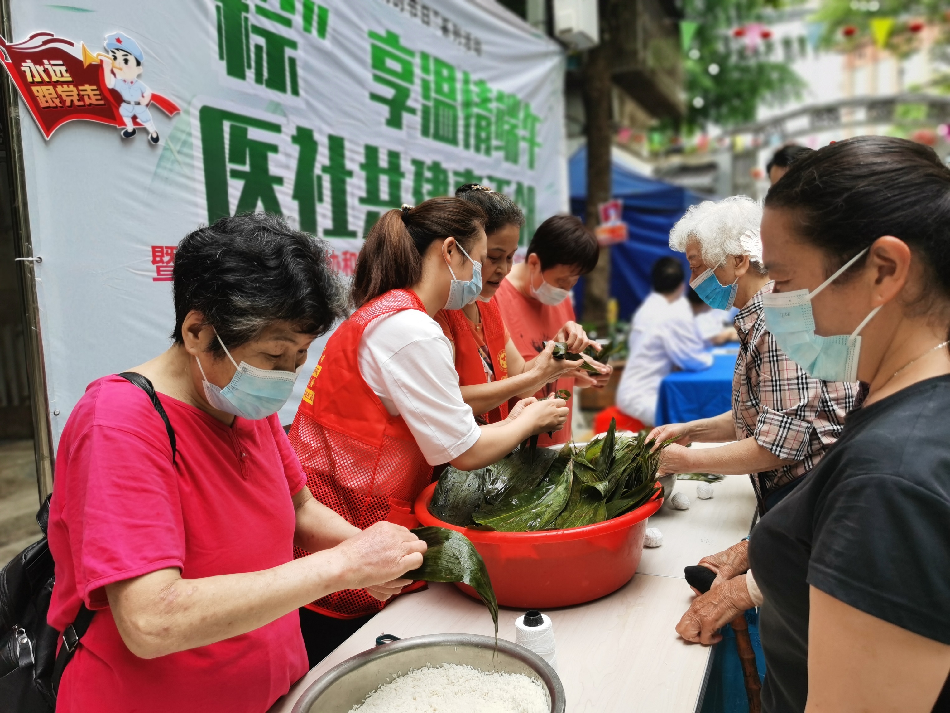 在义诊旁边的社区包粽达人们,正带着社区居民朋友们一起体验民俗文化带来的邻里互助的快乐。