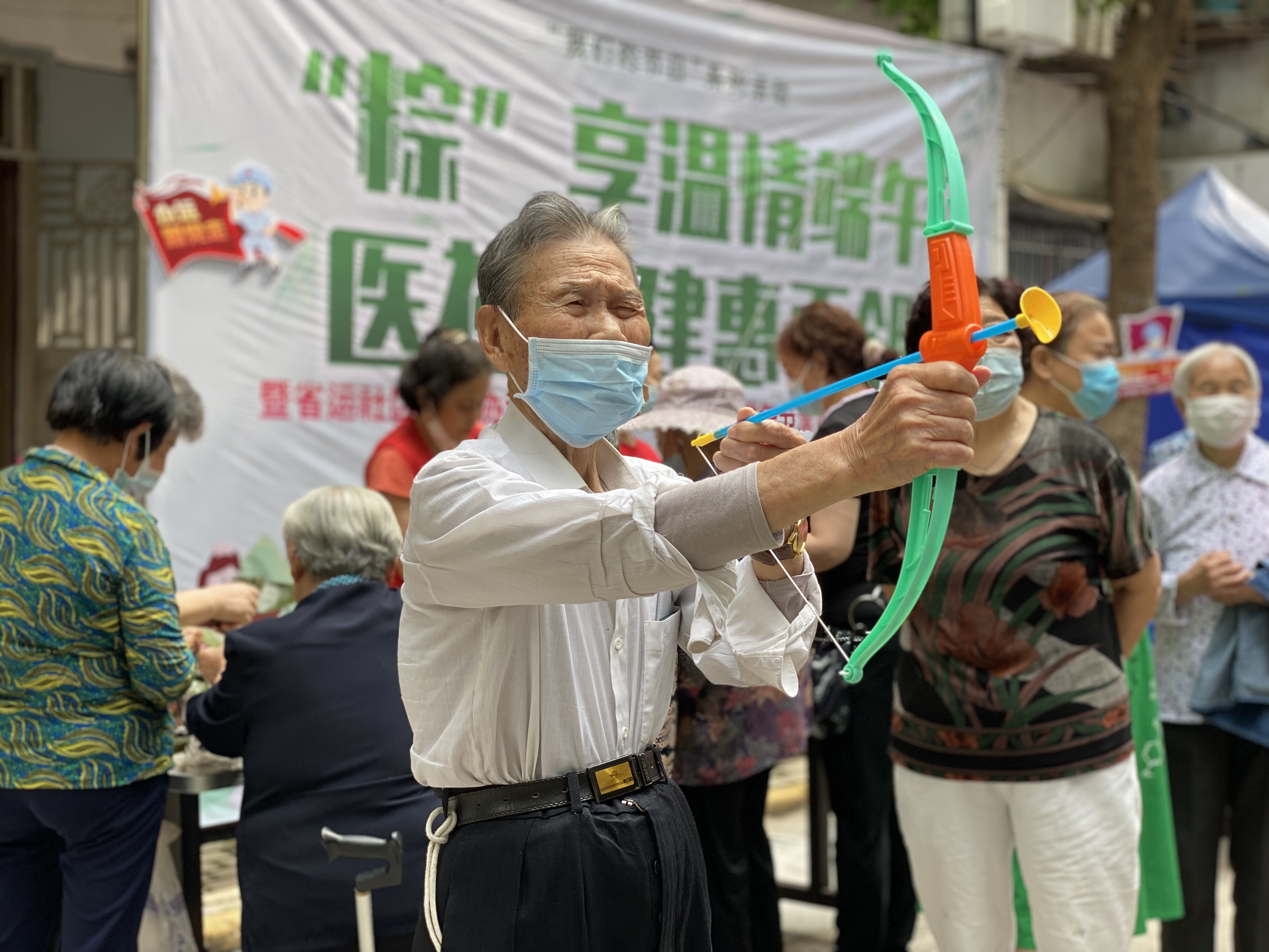 而80岁高龄的刘爹爹更是拉起长弓体验传统民俗游戏“射五毒”。刘爹爹说,“感谢社区,感谢党给我们提供这么好的生活环境,还把志愿者迎到我们社区进行义诊和各类民俗体验活动,这个射箭活动,让我感觉自己又年轻十岁,真是开心。”