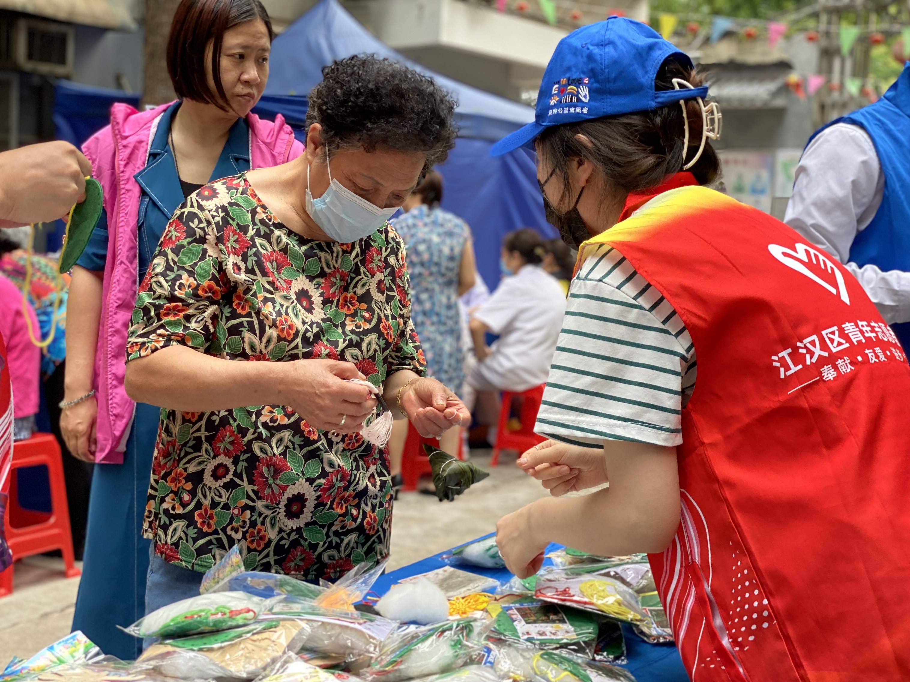 在现场,江汉区青年志愿者协会还组织了贝壳公益志愿服务队的小伙伴,带上包香囊、拼龙舟的半成品到具,手把手教老人一起体验民俗制作的快乐。