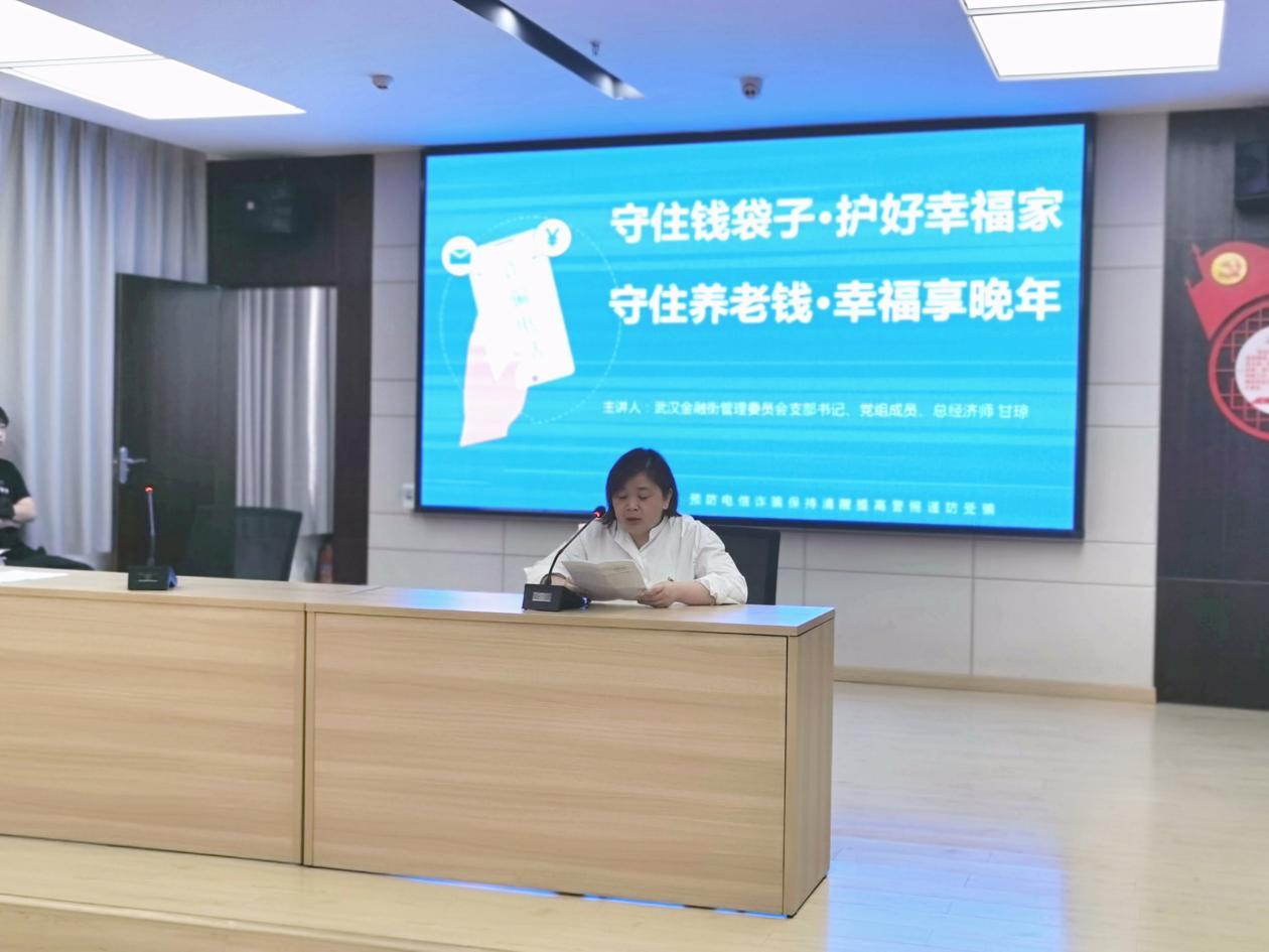 守住养老钱·幸福享晚年”支部主题党日活动正在举行,武汉金融街管委会党组成员、支委会书记、总经济师甘琼给老党员们上了一堂生动的党课。旨在提升社区居民防范非法集资的能力,增强风险防范意识,引导社区居民远离非法集资,自觉抵制非法集资,保护人民群众利益。