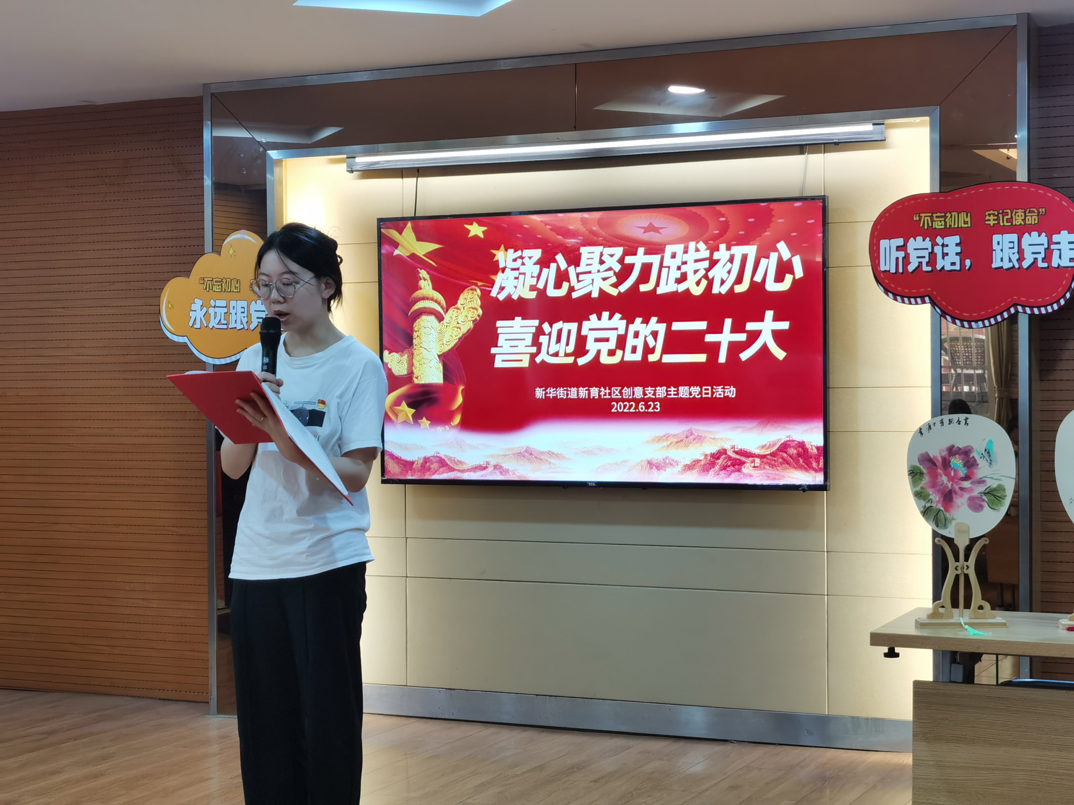 本次活动中,新育社区共建单位辅仁小学方亚祺老师还为社区群众和党员带来了精心创作的以“莲花”“清竹”为主题的工笔画宫扇,收获了现场一片赞叹。