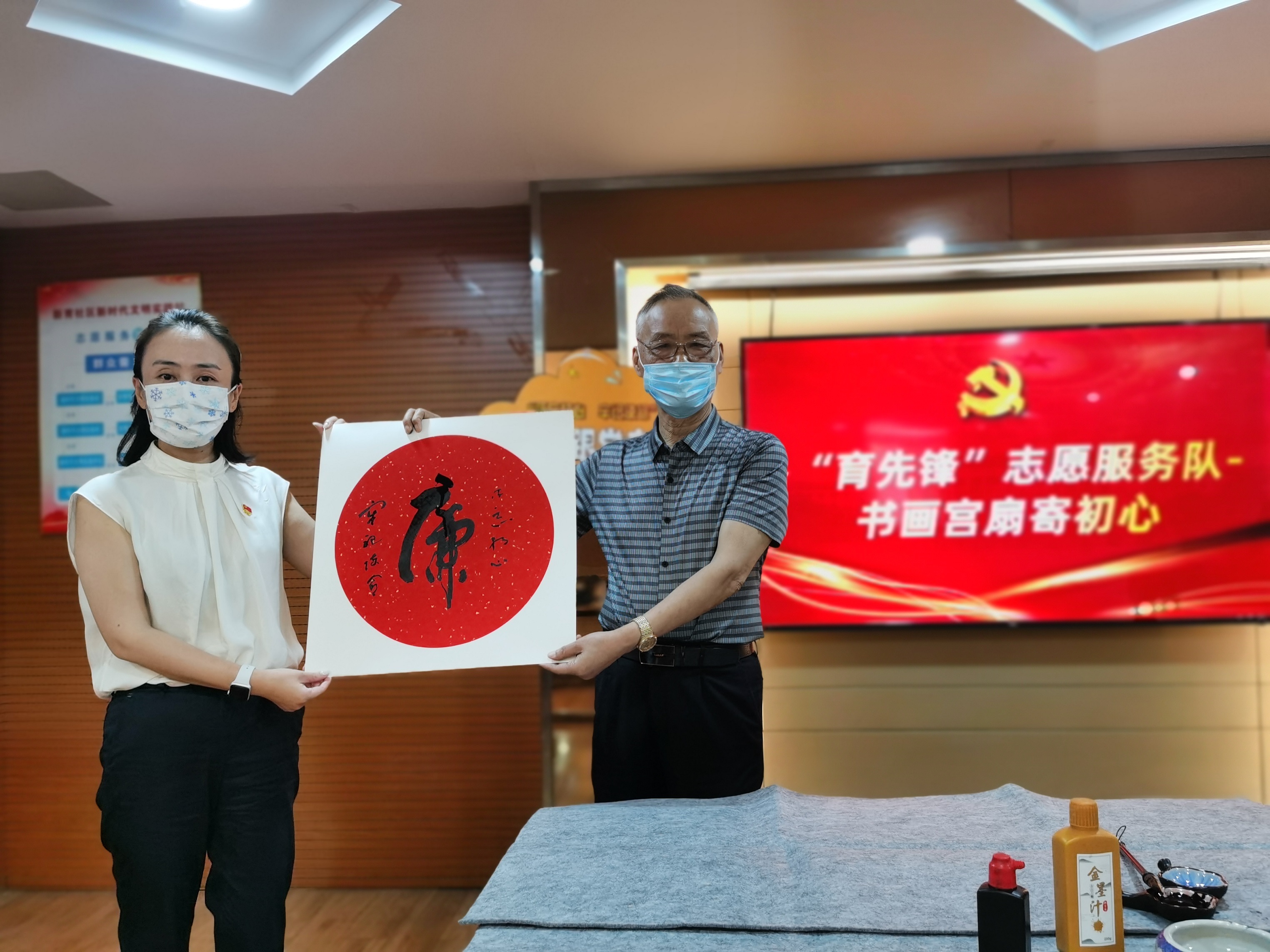 23日上午,新华街道新育社区2楼会议室内,墨香萦绕,两位水墨书画老师正泼墨挥毫即兴创作。他们正是新育社区“育先锋”志愿服务队的老志愿者罗田胜和程世德。只见一笔一划中,一把意境优雅、清新脱俗的莲花便跃然宫扇之上。