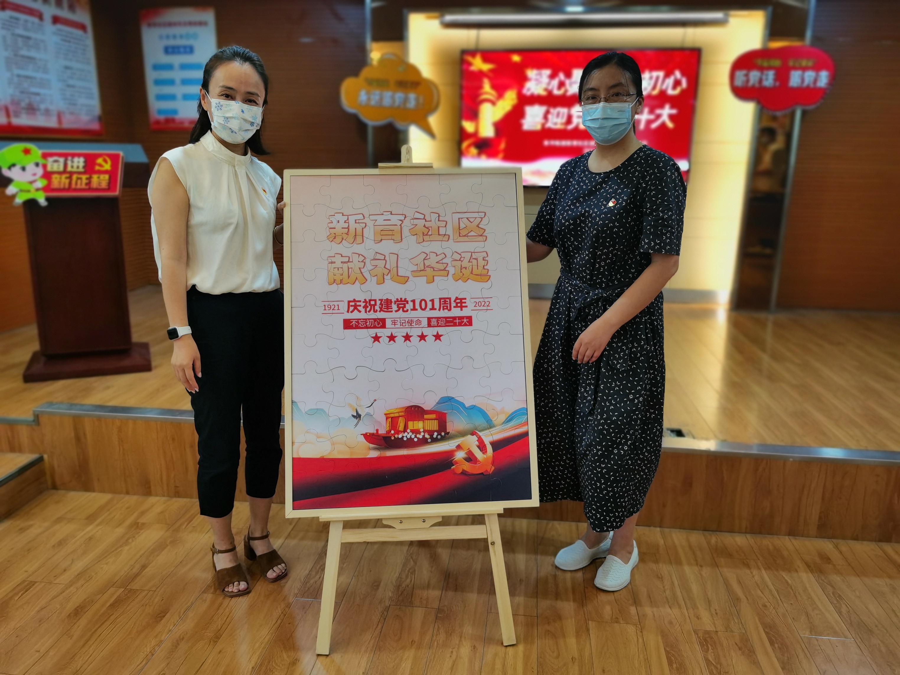 在场老青年党员们以拼图的形式,齐心协力完成了一幅订制“书香新育 献礼华诞”红色主题拼图作品画。”所有党员在完成拼图后,齐聚台前进行合影留恋。