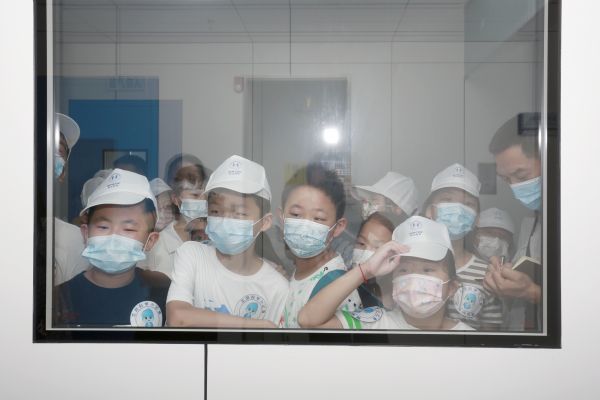 透过观察窗,小记者们对实验室里的一切都很好奇。