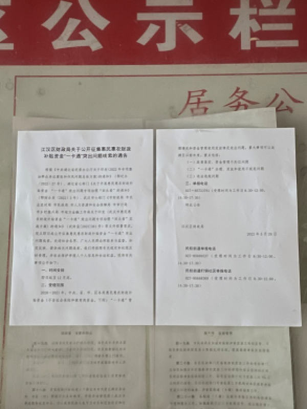 为巩固拓展党史学习教育“我为群众办实事”实践活动成果,深化惠民惠农财政补贴资金“一卡通”专项治理成效,切实解决惠民惠农财政补贴资金发放过程中存在的突出问题,根据《关于印发<江汉区惠民惠农财政补贴资金“一卡通”突出问题专项治理“回头看”实施方案>的通知》,民权街道和辖区社区认真开展“一卡通”突出问题专项治理“回头看”自查自纠工作。街道召开了工作部署会、成立了工作专班,制定了实施方案,相关政策宣传到位,及时在街道、社区、小区公示栏张贴海报和线索举报电话,入门入户通过发放宣传单和现场讲解的方式宣传“一卡通”相关政策。