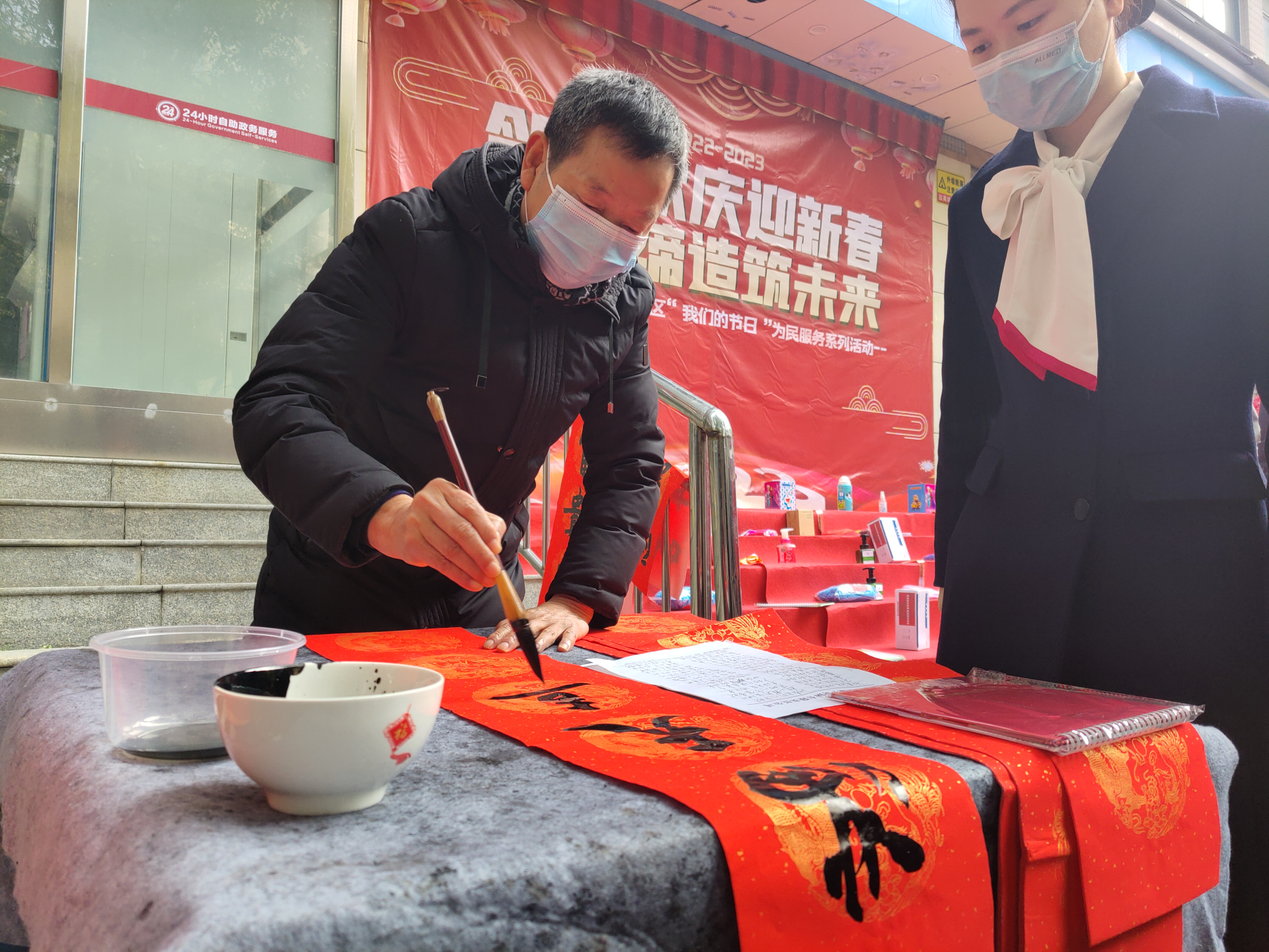 无联不成春,有联春更浓,手写的春联更有意义,一笔一划,写出年的味道。由取水楼社区辖区共建单位浙商银行武汉分行特邀书法老师现场手写春联,令不少居民前来围观。“还是手写春联好看,有墨香有温度。”社区居民张姐拿着春联连连称好。
