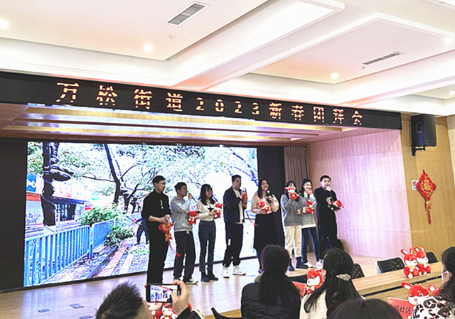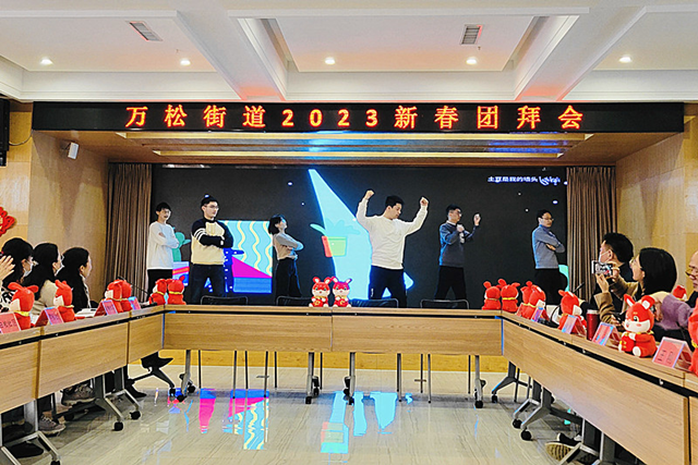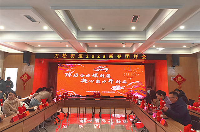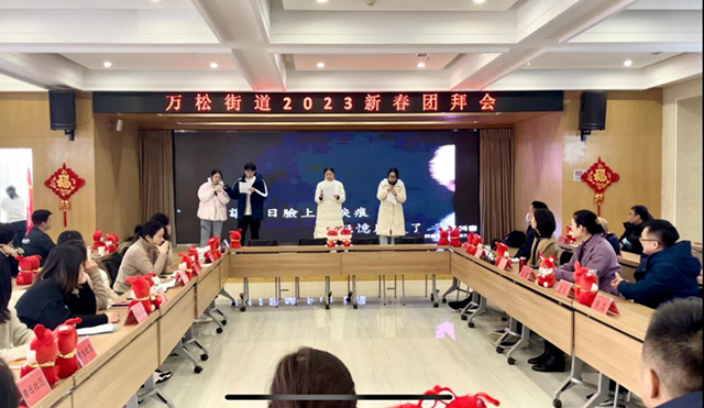 活动现场中国结高挂,桌面上整整齐齐的摆放着兔年吉祥物公仔,处处洋溢着热烈喜庆的气氛。街道工委副书记康娜主持会议,播放了万松街道2022年年度工作短片,回顾了街道一年以来砥砺奋进,向难求成,各项事业蓬勃发展的奋斗历程。
