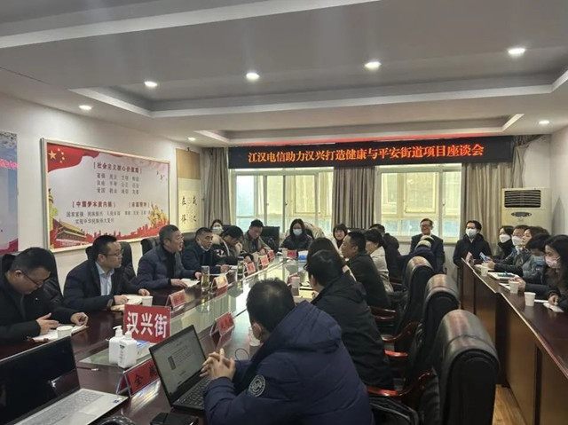 2月7日,江汉电信助力汉兴打造健康与平安街道项目座谈会在汉兴街道召开。中国电信股份有限公司武汉江汉区分公司,中国电信股份有限公司湖北省分公司、武汉市分公司相关业务部,科大讯飞、辰安科技厂家代表和汉兴街道领导班子成员,相关业务科室,社区卫生服务中心,常二、桃林社区书记等约30余人参加座谈。