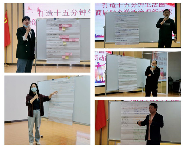 “从社区治理目标出发,全方位对接居民、商企需求,在居民志愿者的基础上,打造商家联盟志愿服务队,联合开展暨能提升居民生活品质又能提高商企流量的活动,形成‘社商居’长效互动机制。”“摸清商户资源清单,有针对性整合资源。”“推进‘五星’商户、‘五星’志愿者评选”……5个小组围绕摸底需求、整合资源、多元融合、共同缔造等多维度建言献策,“可以思路打开,推进跨街道、跨区域的商业资源融合,比如雪松路美食街和花园道商业区的联动,为居民提供更丰富、更实惠的服务,也为企业、商户搭建更优质的互利平台。”