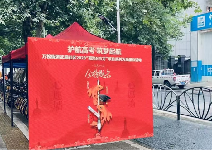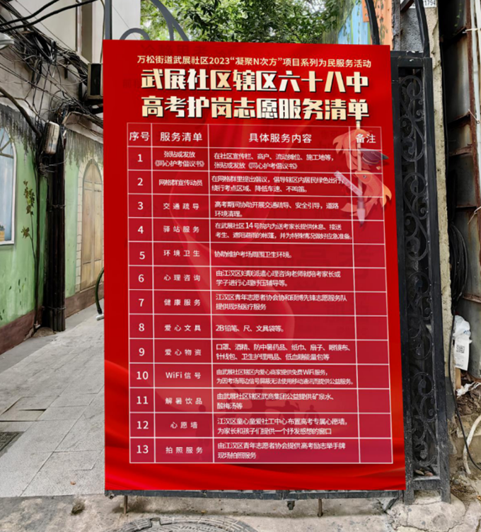 6月6日,志愿者们在武汉市第六十八中学附近和武展社区14号院内搭建起高考爱心驿站,为该考点的考生和家长提供各类爱心服务,为高考学生保驾护航。志愿者向沿街商户、摊贩以及施工点位发放《同心护考倡议书》提醒减少噪音,网格员在线上呼吁居民绿色出行。