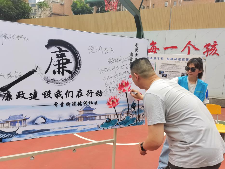 图为常青街道工委副书记、办事处主任操锋在廉洁文化牌上签字