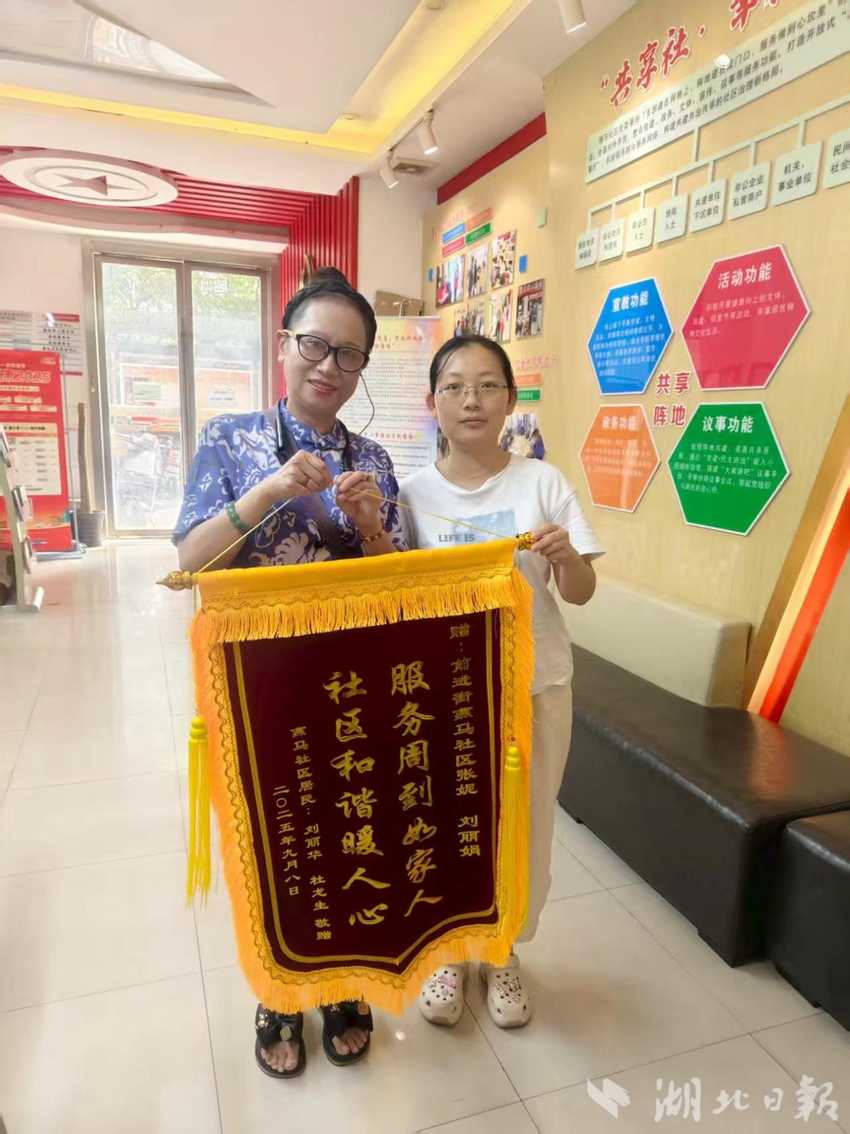 9月10日,燕马社区低保精神残疾家庭小杜的母亲刘阿姨紧紧攥着一面印着“服务周到如家人 社区和谐暖人心”的锦旗,郑重送到了前进街道燕马社区居委会。刘阿姨脸上满是感激,拉着社区干事张妮和包保两委刘丽娟的手连声道谢,这面锦旗,是对社区贴心帮扶的深情回馈,更是对社区干事暖心守护的高度认可。