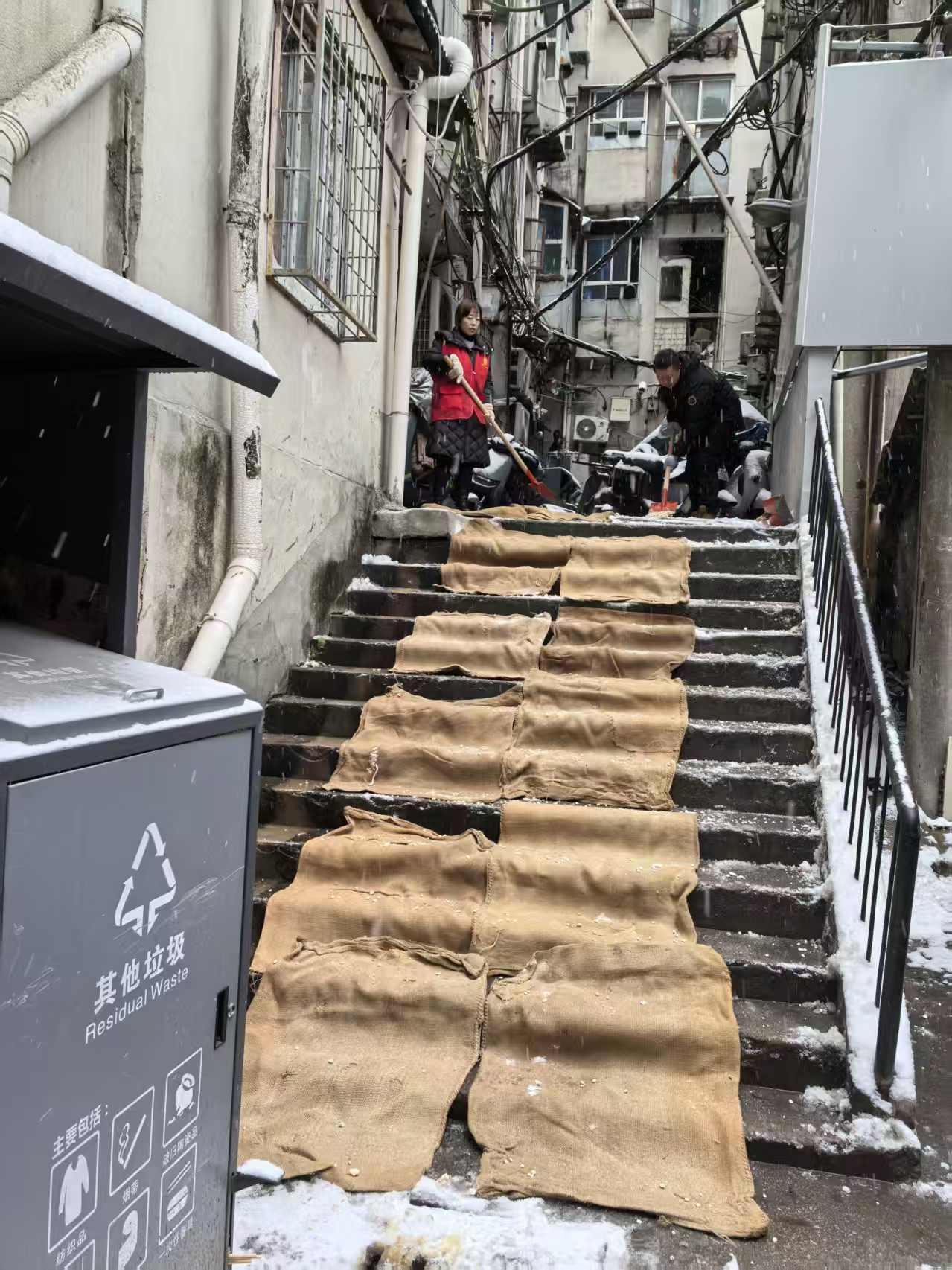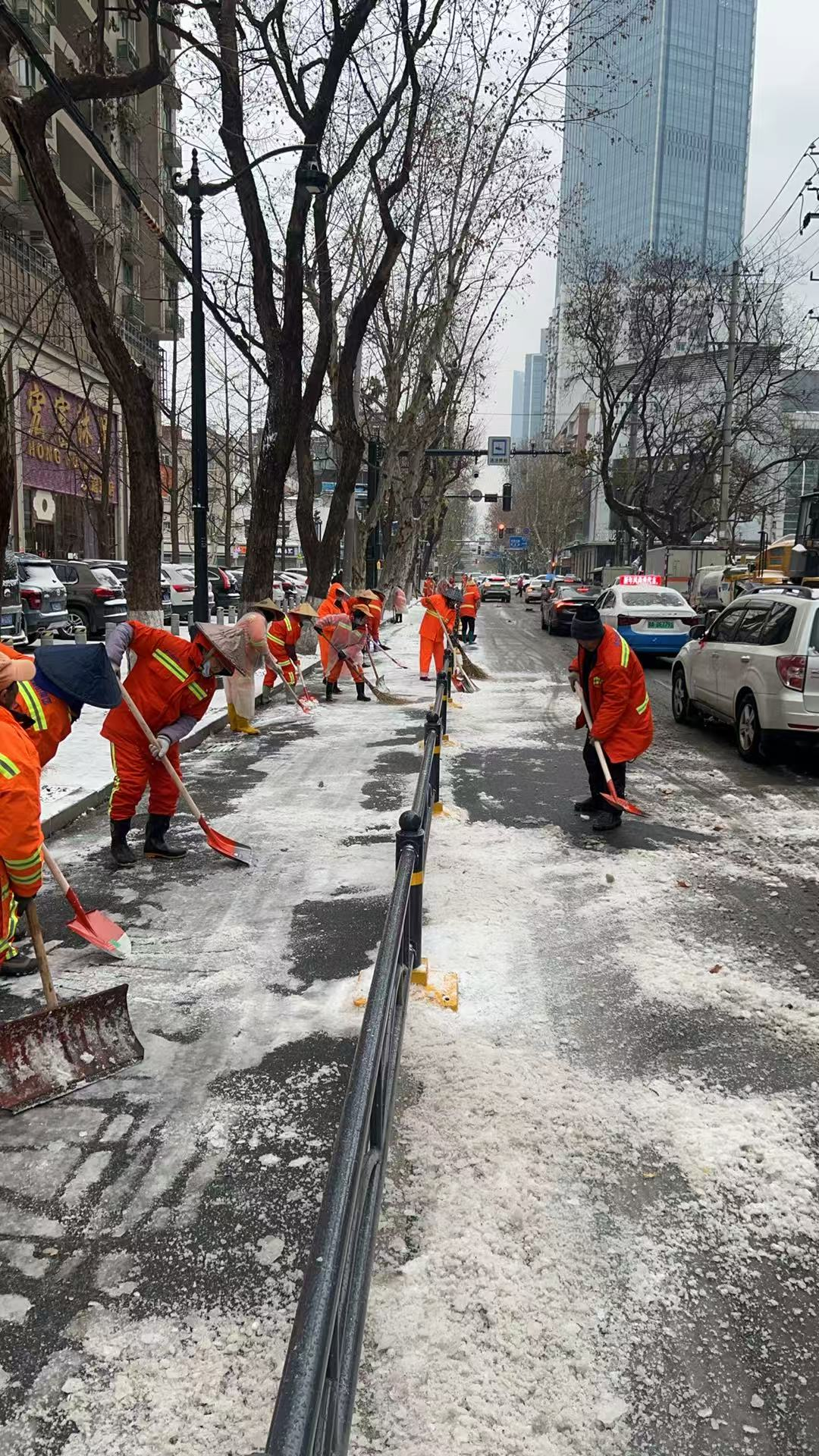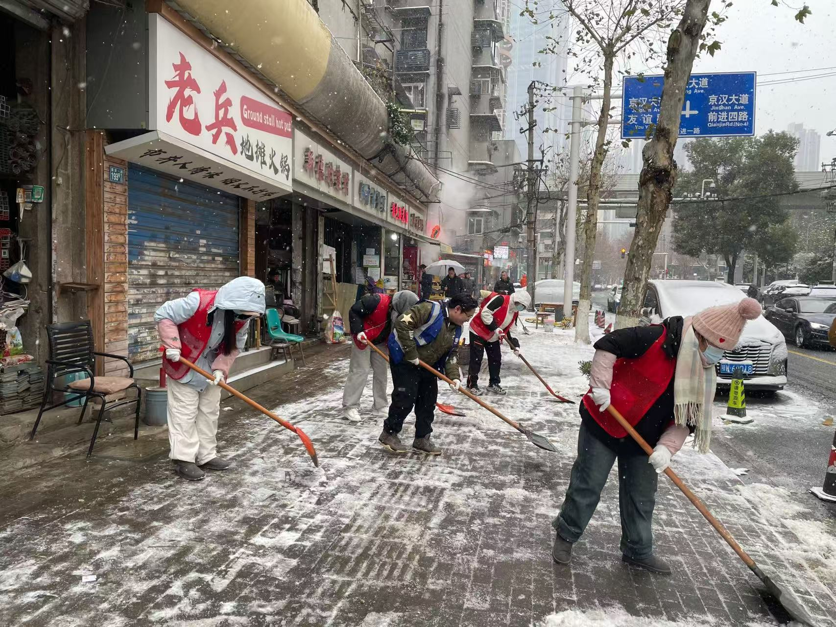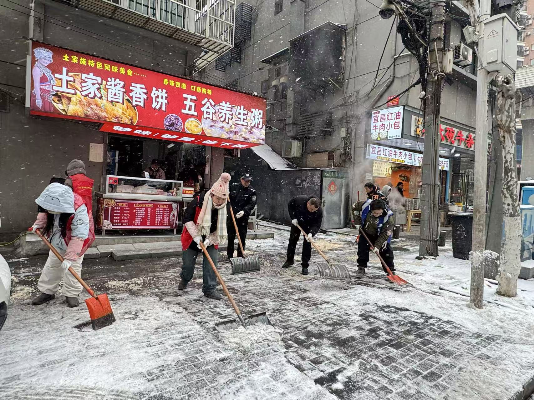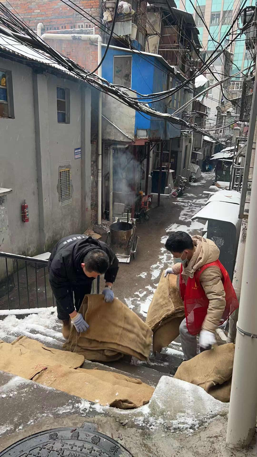 2026年1月20日,民意街道全力做好低温雨雪冰冻灾害天气应对处置工作。民意街道工委书记操锋、办事处主任胡刚亲自带队,组织街道机关干部兵分多路下沉对口社区,与社区工作者、环卫工人、城管队员协同作战,并发动辖区商户严格落实“门前三包”责任,全面开展铲雪除冰工作。此次行动聚焦道路主干道、人行通道、小区出入口、地铁站口、学校路口及背街小巷等关键区域。早上6时分三次对民意街进行撒融雪剂并铺设麻袋。使用融雪盐3000斤,麻袋150条,出动环卫工人60余人从20日凌晨4时开始对民意街进行除雪铲雪工作,7时许对辖区各重点路段再次进行重点除雪、铲雪、融雪工作。把重点路段友谊路、自治街及路段交接口全部清理完成,多措并举消除安全隐患,切实保障了居民出行安全和交通秩序畅通,用实际行动筑牢辖区出行“安全防线”。