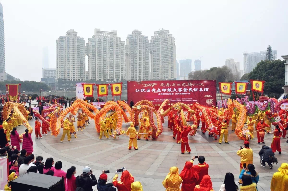 龙腾江汉,鼓闹新春。6日下午,由武汉市江汉区人民政府主办、江汉区文化局承办的迎春月·龙腾江汉舞龙锣鼓大赛暨民俗表演在西北湖绿化广场隆重举行。