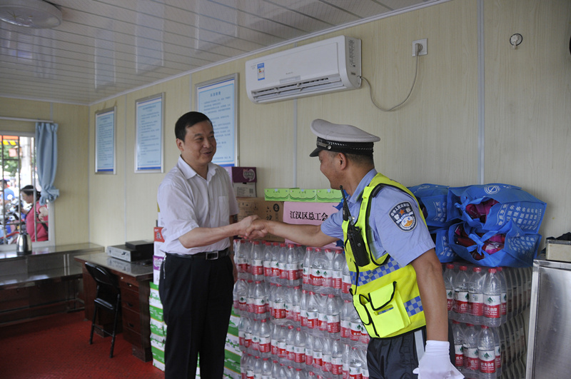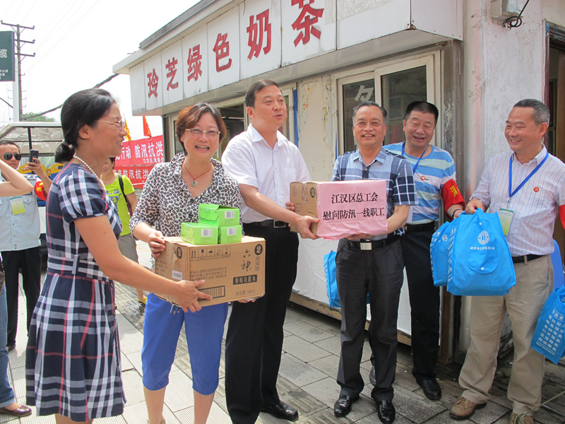 7月7日上午,江汉区区委常委、区总工会主席张劲,党组书记兼常务副主席方华辉率干部职工等一行8人,再次赶赴沿江一线8个防汛值守点,看望和慰问了满春街、民族街、民权街、花水街、龙王庙险段等奋战在防汛抗洪一线的干部职工,并送去了防暑驱蚊的风油精、花露水、毛巾等慰问物资。
