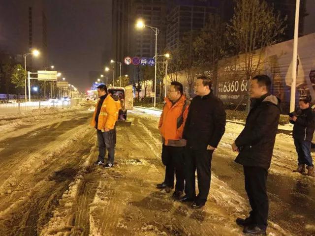 1月28日凌晨,区委常委、常务副区长张劲来到武汉中央商务区淮海路等地,检查区城管委融雪除冰工作。