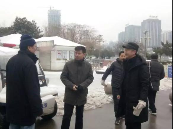 世贸广场购物中心、中山公园管理处、市路灯管理服务中心组织干部职工扫雪除冰。