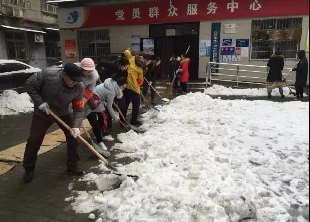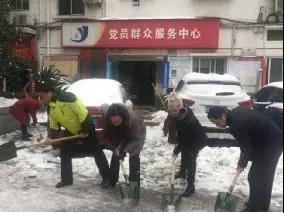 组织党员志愿者到世彩社区铲冰除雪,消除安全隐患。