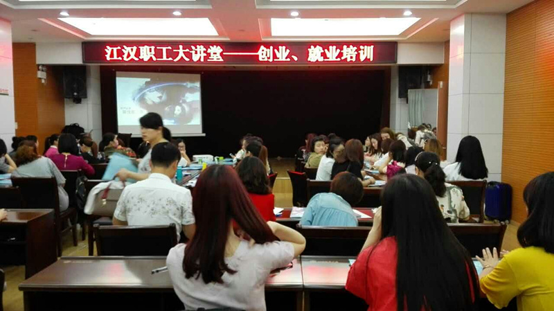 5月24日,江汉区总工会职工大讲堂2016年创业、就业培训暨江汉区首期女性美容技能培训隆重开班,本期培训共开展2天,近200名学员参加了培训。 培训过程中,郡艺国际美容高级讲师王春花以从业者职业 道德破题,着重对化妆造型、产品使用、雾眉技术要点等理论知识进行了讲授,并通过实操演示的方法,引导学员注重美容细节的应用。 培训现场,授课老师与学生之间互动火热。
