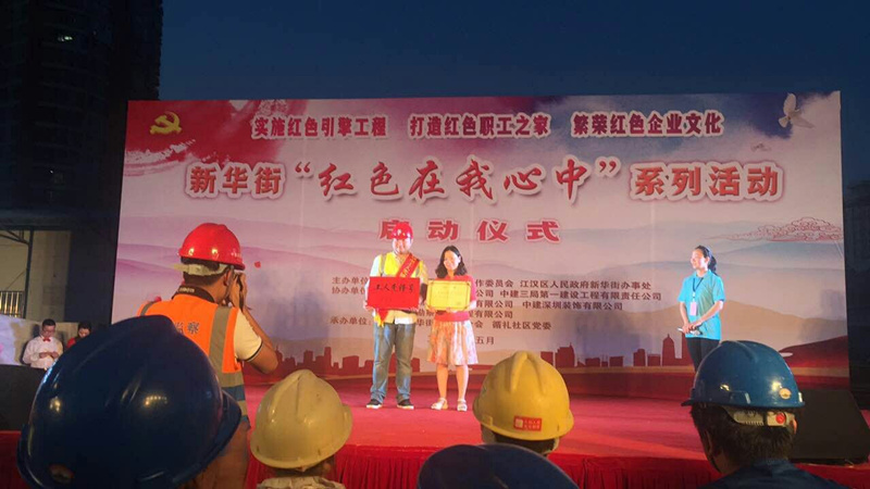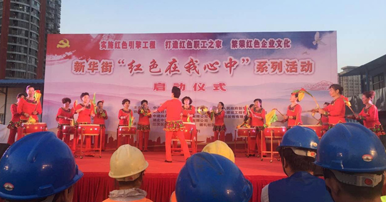 5月17日晚,新华街工会在武汉越秀地产开发有限公司精武路项目部工地举办了以“实施红色引擎工程,打造红色职工之家,繁荣红色企业文化”为内容的“红色在我心中”系列活动启动仪式。本次活动得到了区总工会、街党工委、街办事处、武汉越秀地产、中建三局第一建设工程有限责任公司、中建四局第六建筑工程有限公司、中建深圳装饰有限公司、湖北中南勘察基础工程有限公司的大力支持。