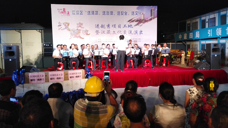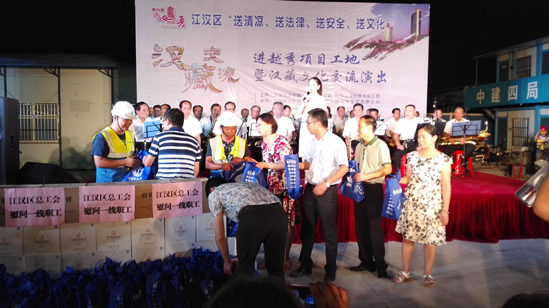 8月17日晚7时半,江汉区“送清凉、送法律、送安全、送文化”进越秀工地暨汉藏文化交流演出在新华街中建四局工地隆重开展,区总工会党组书记、常务副主席方华辉、区文化局局长张建明、新华街工委书记杨俊、中建三局与中建四局项目书记,以及近300名建筑工地工友参加了活动。