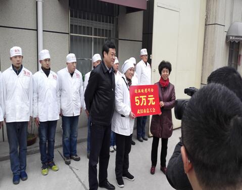 2月4日,省总副主席、市总工会党组书记、常务副主席李丹芳,市总工会副主席黄开峰等一行,在区总工会党组书记、常务副主席方华辉陪同下,来到武汉市东方红食品有限公司,看望慰问了全国劳模“犟妈”易勤,并为智障员工送去5万元春节慰问金。