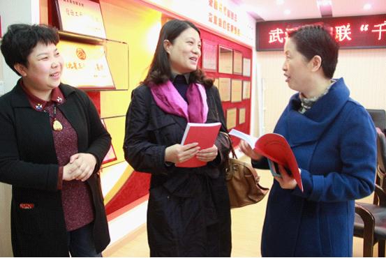 市妇联副主席魏静向江汉区委副书记殷玉梅介绍“下基层”活动安排。