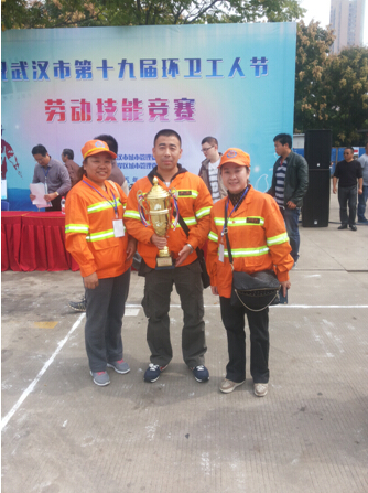 10月9日、10日,武汉市城管委举行了武汉市第十九届环卫工人节职工劳动技能比赛。此次比赛分为理论知识考试和钩臂车、扎扫帚、电瓶车捡垃圾等项目的实际操作,全市十七个城区派出选手参加。由江汉区城管委组队参赛的张凯、范红燕、李红芳三名选手从众多选手中脱颖而出,获得团体一等奖。