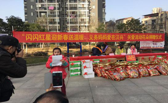 元月,江汉区检察院郭艳萍“大手拉小手”工作室巾帼文明岗的义务妈妈们走进汉兴街姑嫂树社区爱心花朵教育咨询中心。义务妈妈们与流动花朵、单亲母亲结对,为他们送来了500斤大米、4盒米糕、40个大礼包、84壶油、25袋米。