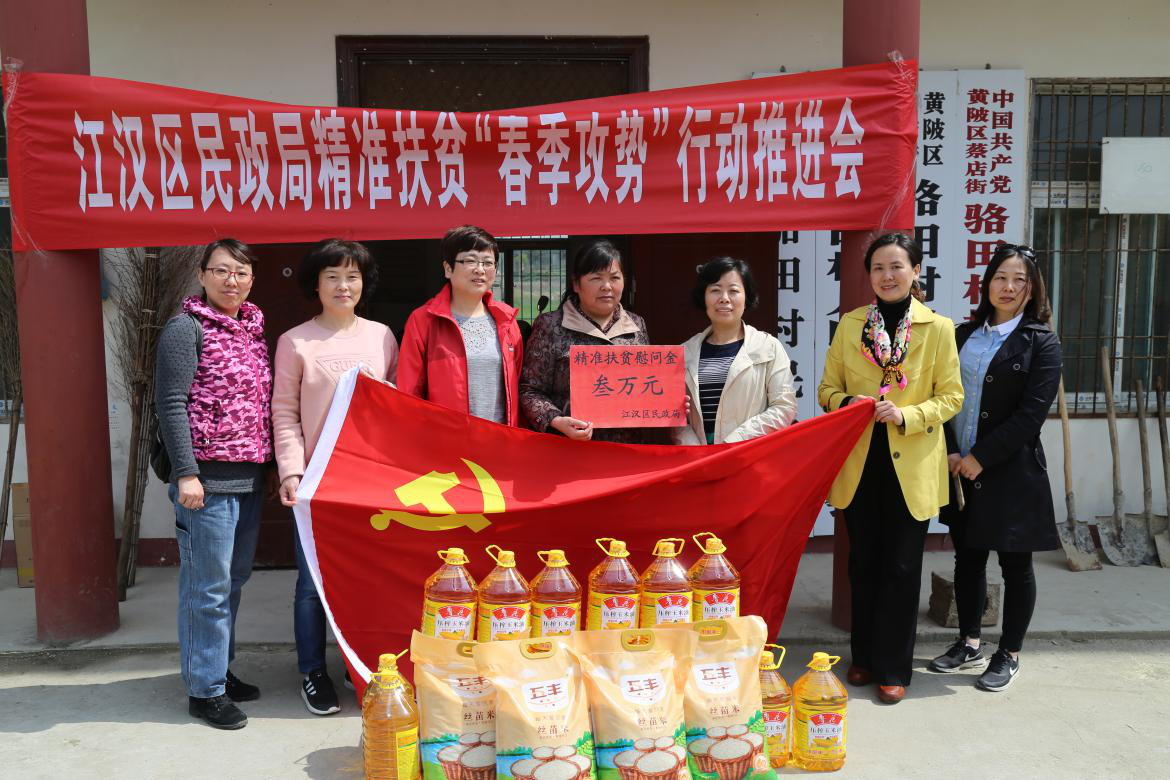 江汉区民政局婚姻登记处“巾帼文明岗”开展精准扶贫“春季攻势”行动,走访慰问黄陂蔡店街骆家田村结对的贫困妇女家庭,为他们资助了3万元扶贫款及米、油等物资。
