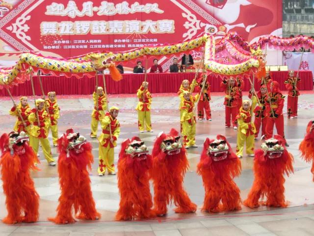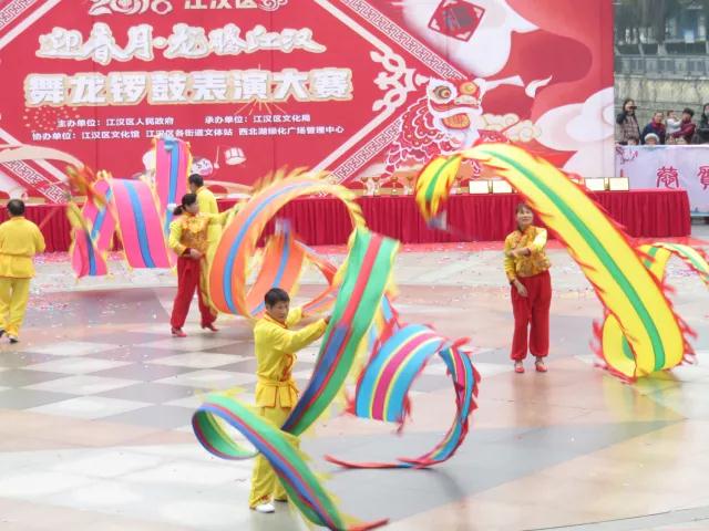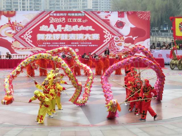 “欢乐的锣鼓震天响,喜庆的节目演不完。”今年,由江汉区十二条街道及文化馆选送的21个舞龙锣鼓及民俗节目,在西北湖广场隆重上演。