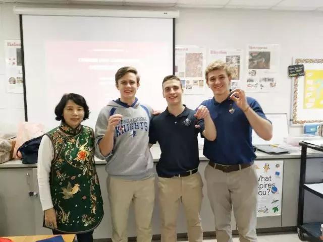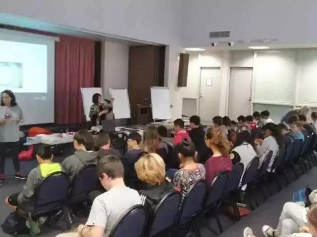 ▲王子怡在美国中学讲汉绣,外国学生们听得津津有味,座无虚席。