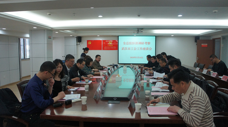 3月14日,中华全国总工会组织部副巡视员刘红梅、干部处王斌、王沛雨一行赴江汉区开展工会干部队伍建设情况专题调研。省总工会组织部副部长陈维,市总工会党组书记、常务副主席李丹芳,党组成员、副主席王怀卓等陪同调研,全市10个城区工会负责同志参加调研活动。