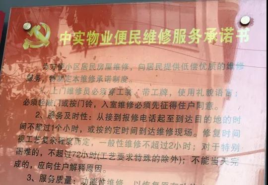 及时服务、为民解困,是“红色物业”对居民的承诺。在九头鸟小区,中实物业与唐家墩街办事处通力协作,建立起江汉区第一个红色物业维修站,制定了规范化维修服务流程,聘请了专业维修师傅,提供安装灯泡、换水龙头、疏通下水道等维修服务,维修价格低于市场价40%左右。